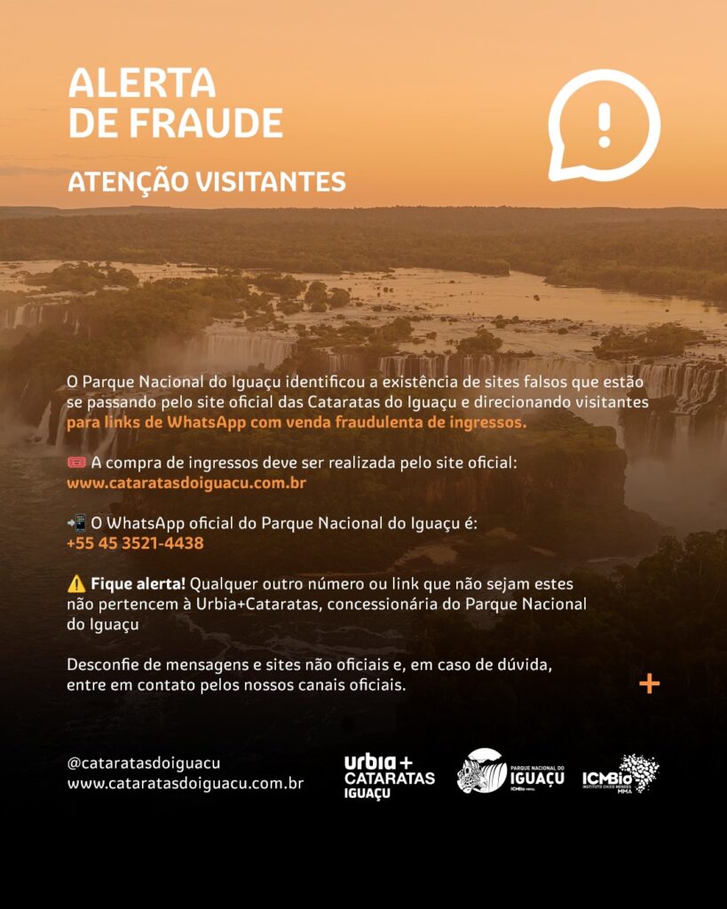 A Urbia+Cataratas, concessionária responsável pela visitação ao Parque Nacional do Iguaçu, alerta para que os visitantes desconfiem de links, sites ou números de WhatsApp não oficiais. Nesse sentido, com atenção especial àqueles que prometem facilidades, descontos ou direcionam para compras fora dos canais oficiais.