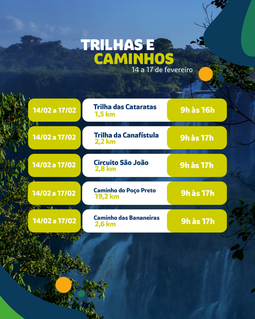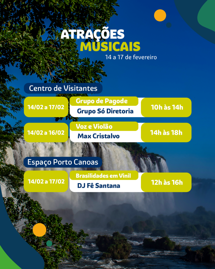 Além do horário ampliado, o atrativo terá atividades e atrações musicais inclusas no ingresso de entrada. Assim, opções como pagode, DJ e voz e violão vão animar a visita na chegada ao Centro de Visitantes, ao longo do passeio e no Espaço Porto Canoas, ao final da Trilha das Cataratas.
