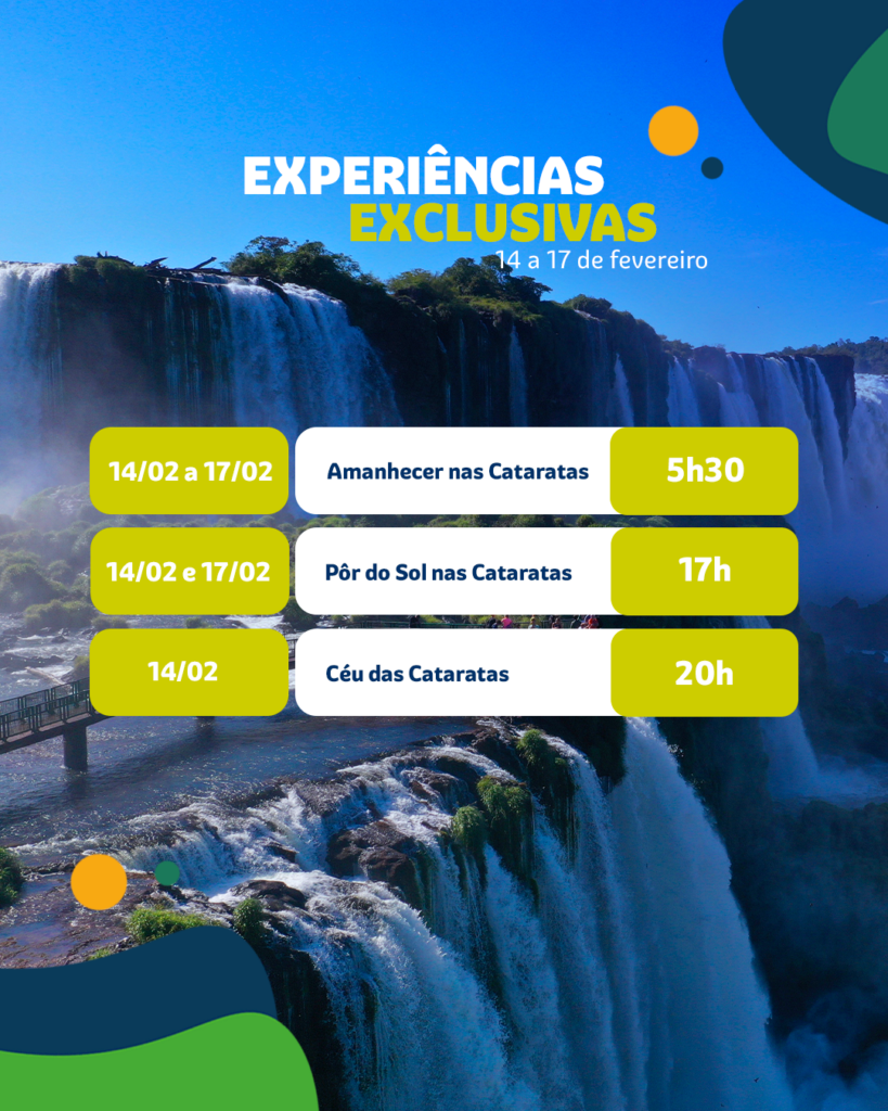 Outras experiências seguem a programação regular: a sessão de astroturismo, Céu das Cataratas, será realizada no dia 14, sábado. Dessa maneira, o Pôr do Sol nas Cataratas, com bebidas e música ao vivo, está programado para o sábado, dia 14, e a terça-feira, dia 17. Porém, todas as experiências têm vagas limitadas e, em períodos de recesso, costumam esgotar-se rapidamente. Por isso, a recomendação é garantir o ingresso com antecedência.