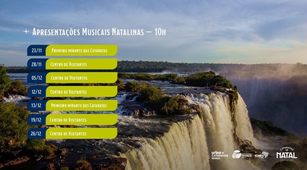 De 23 de novembro a 26 de dezembro, logo, quem visitar as Cataratas do Iguaçu, Maravilha Mundial da Natureza, poderá vivenciar momentos únicos, com apresentações musicais, ambientações temáticas e o espetáculo inédito “Cataratas de Natal — O Canto das Águas”. Logo, a apresentação será o ponto alto da programação, com a primeira orquestra à base de água do mundo.