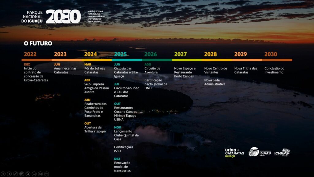 Para os próximos anos, as novidades previstas incluem o Circuito de Aventura, com trilhas suspensas, tirolesas, trenós e torres de observação às margens do Rio Iguaçu; a nova Trilha das Cataratas, que será totalmente revitalizada, com novos mirantes, trechos duplicados e ampliação da passarela com vista para a Garganta do Diabo; a revitalização do tradicional Espaço Porto Canoas, que ganhará conceito arquitetônico renovado, deque panorâmico e áreas para eventos. Além da expansão da visitação para outros polos, levando estrutura e oportunidades a municípios como Capanema, São Miguel do Iguaçu e Céu Azul, que estão no entorno do parque.