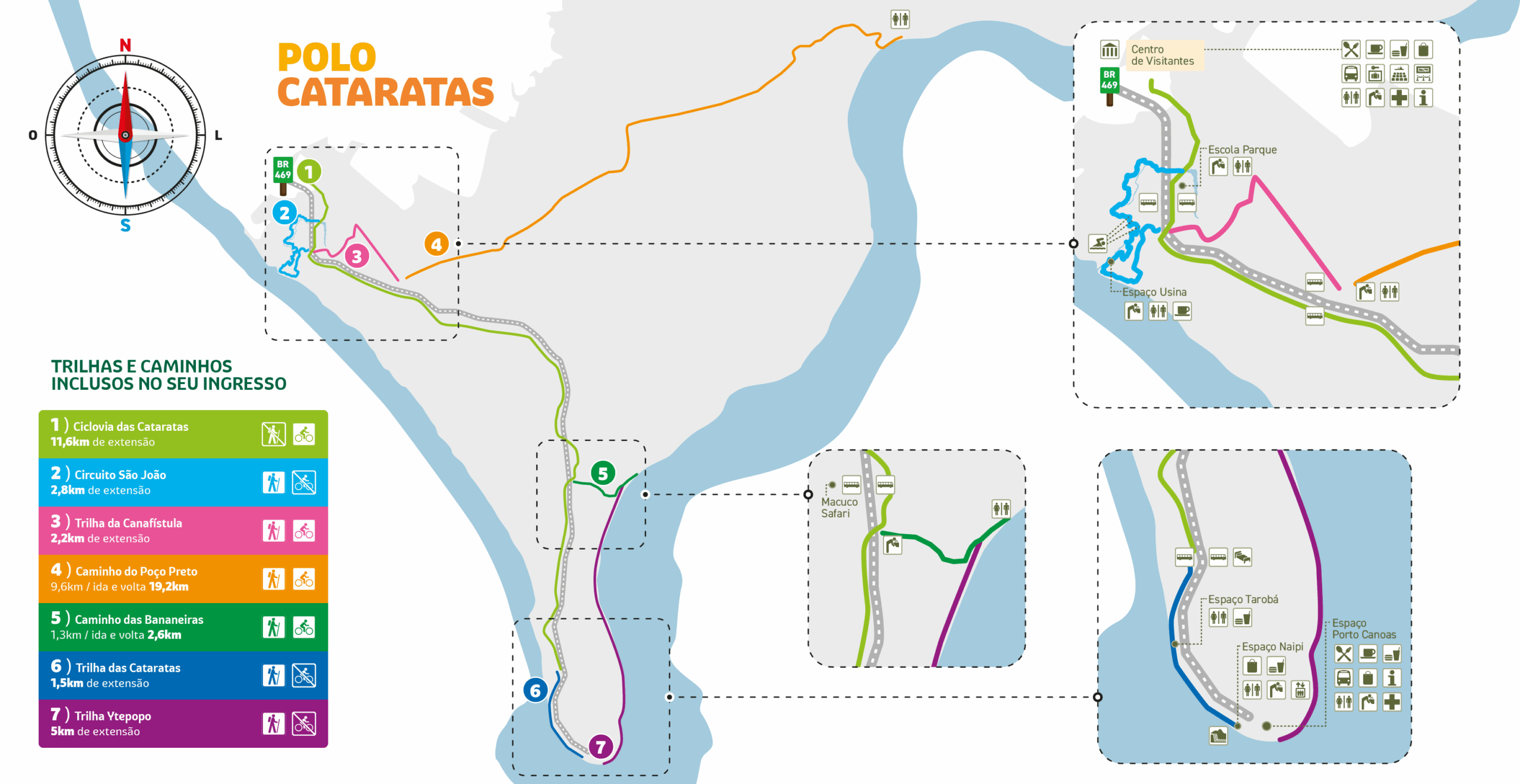 O novo contrato de concessão amplia para quatro polos as possibilidades de visitação no Parque Nacional do Iguaçu. Além da requalificação e manutenção de todas as trilhas existentes nos polos, ainda há previsão de requalificação dos equipamentos de lazer fora do Polo Cataratas, tais como parque infantil, mobiliário urbano, quadra esportiva e academia ao ar livre em alguns locais. Confira as áreas dos novos polos: Polo Cataratas (Foz do Iguaçu), 5.592 hectares; Polo Silva Jardim (Serranópolis do Iguaçu), 29.244 hectares; Polo Rio Azul (Céu Azul), 3.098 hectares; e Polo Ilhas do Iguaçu e Gonçalves Dias (Capanema), 30.526 hectares.